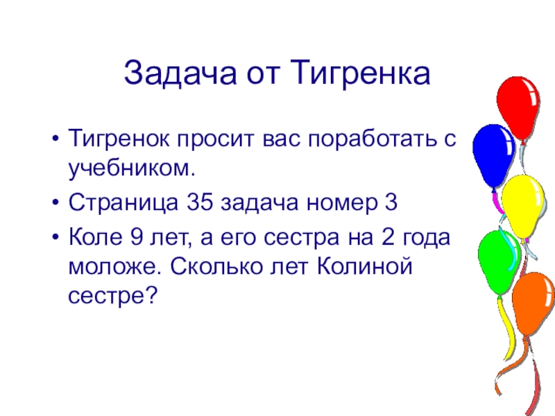 Задача от ТигренкаТигренок просит вас поработать с учебником.Страница 35 задача номер 3Коле 9 лет, а его сестра