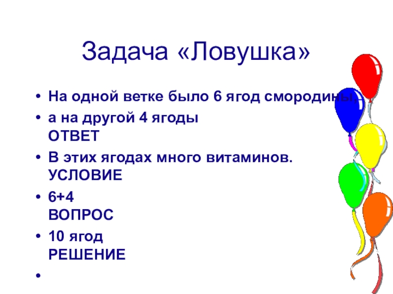 Задача «Ловушка»На одной ветке было 6 ягод смородины,а на другой 4 ягоды