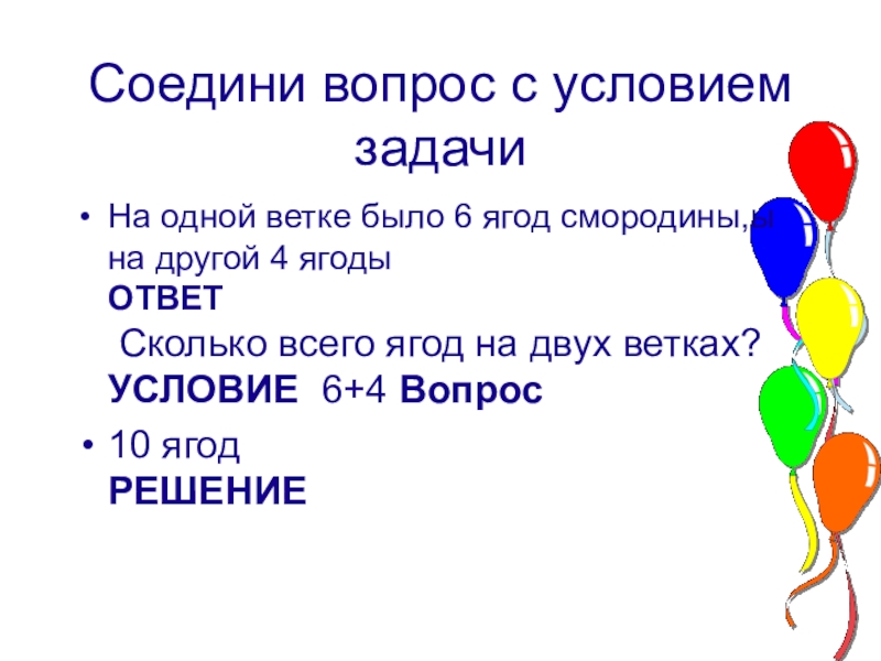 Соедини вопрос с условием задачиНа одной ветке было 6 ягод смородины,ы на другой 4 ягоды