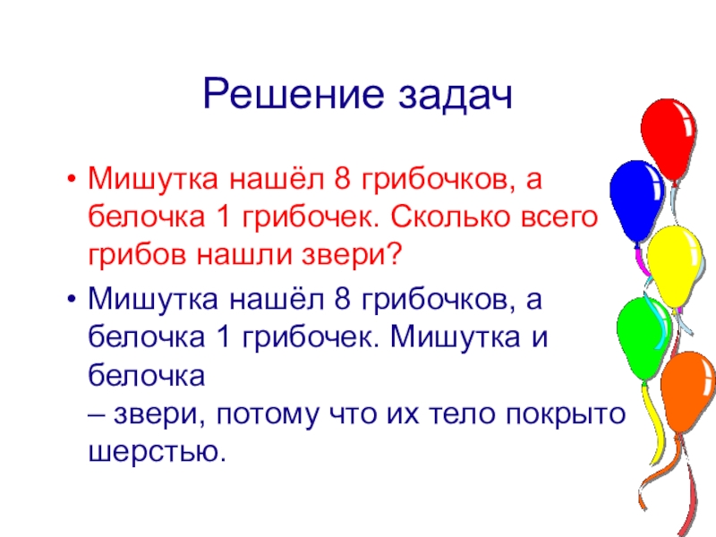 Мишутка нашёл 8 грибочков, а белочка 1 грибочек. Мишутка и белочка  – звери, потому что их тело покрыто шерстью.