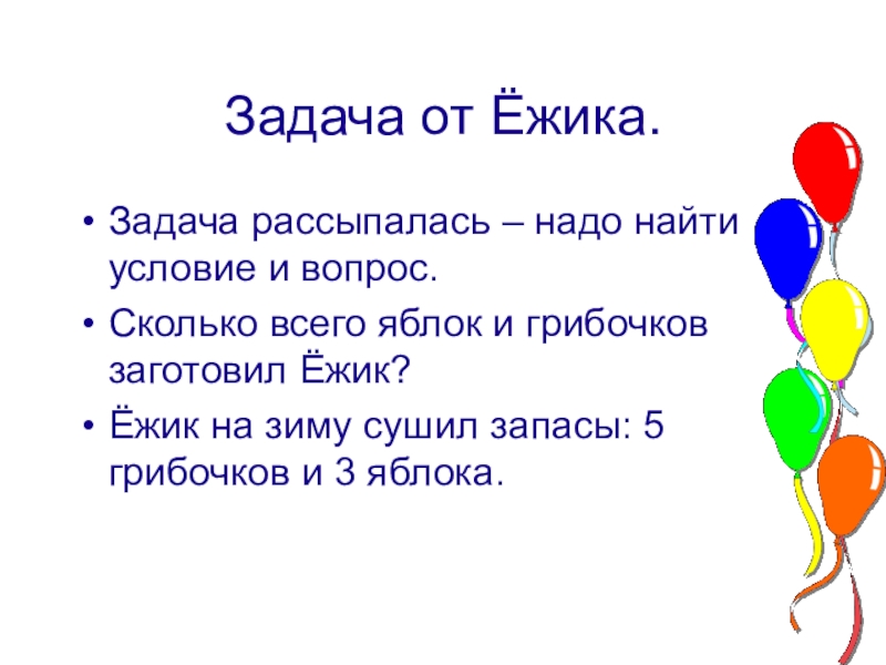 Задача от Ёжика. Задача рассыпалась – надо найти условие и вопрос.Сколько всего яблок и грибочков заготовил Ёжик?Ёжик