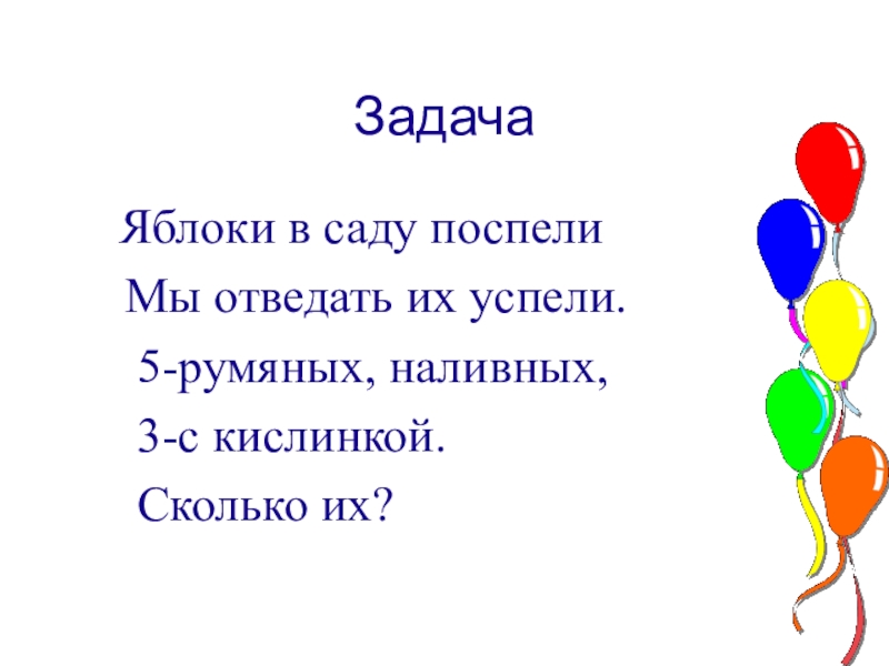 Задача  Яблоки в саду поспели  Мы отведать их успели.   5-румяных, наливных,