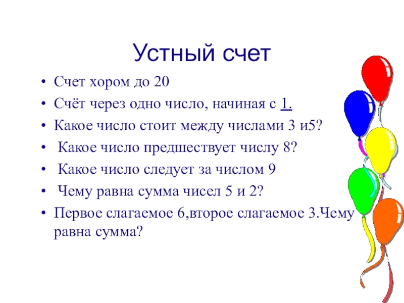 Устный счетСчет хором до 20Счёт через одно число, начиная с 1.Какое число стоит между числами 3 и5?  Какое число предшествует числу 8? Какое число следует за числом 9 Чему равна сумма чисел 5 и 2?Первое слагаемое 6,второе слагаемое