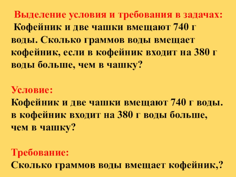 Выделение условия и требования в задачах: Кофейник и две чашки вмещают 740 г воды. Сколько граммов воды