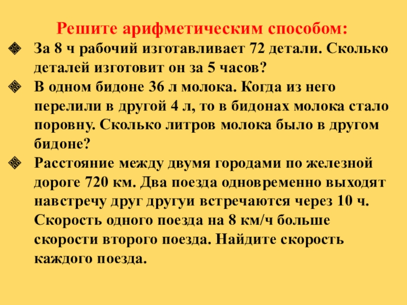 Решите арифметическим способом:За 8 ч рабочий изготавливает 72 детали. Сколько деталей изготовит он за 5 часов?В одном