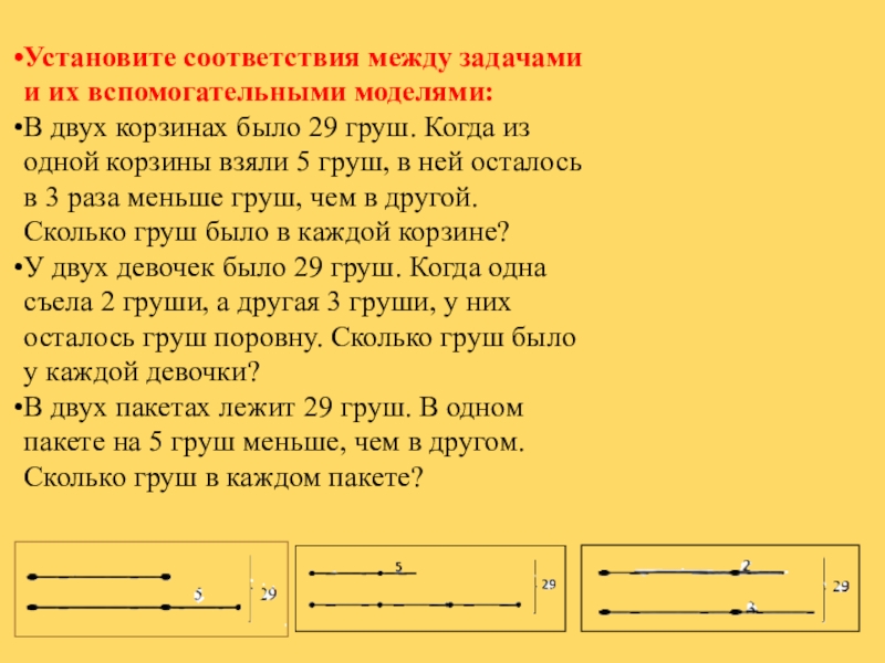 Установите соответствия между задачами и их вспомогательными моделями:В двух корзинах было 29 груш. Когда из одной корзины