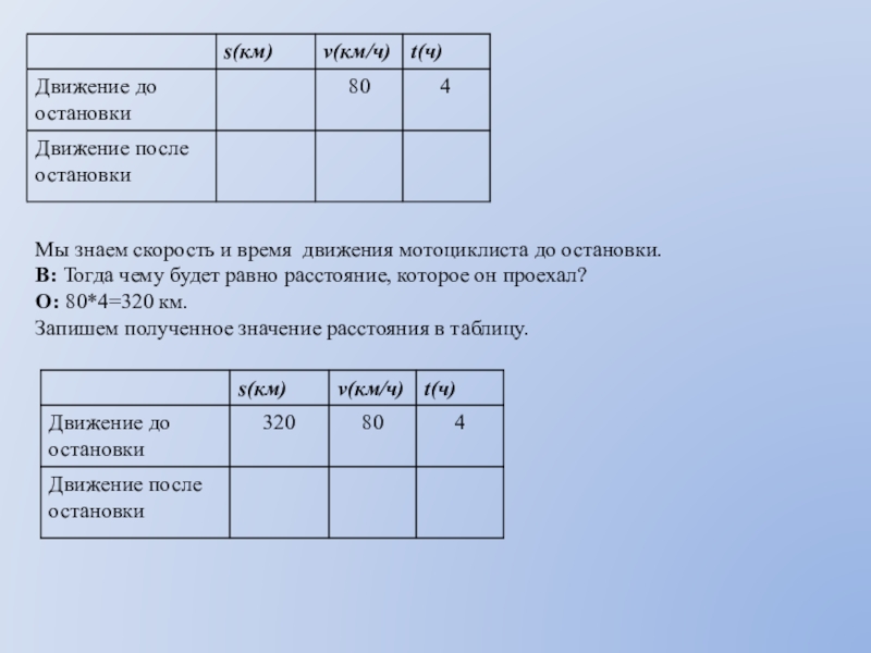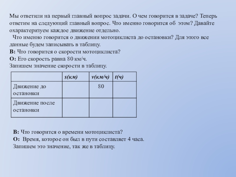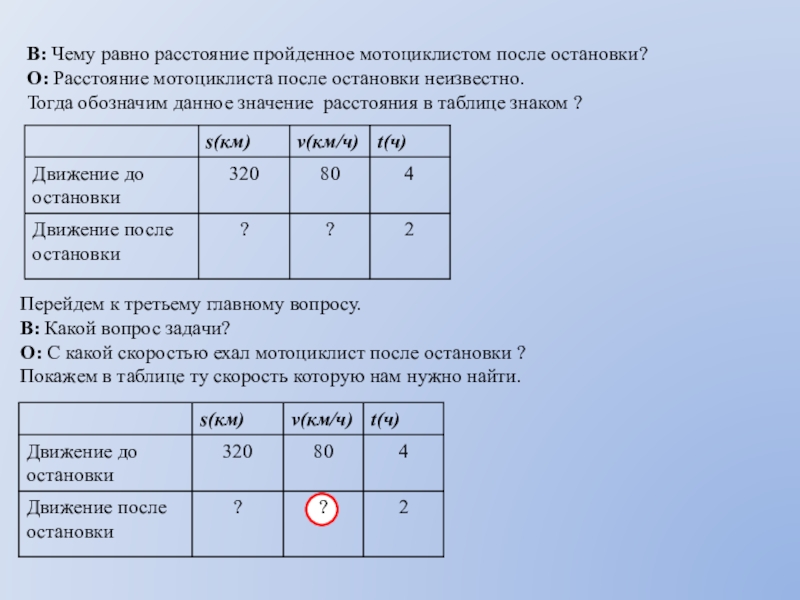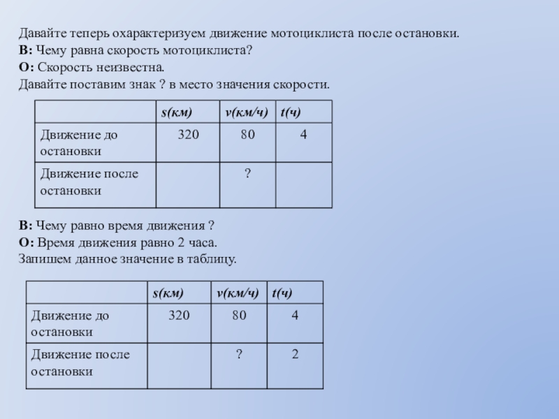 О: С какой скоростью ехал мотоциклист после остановки ?