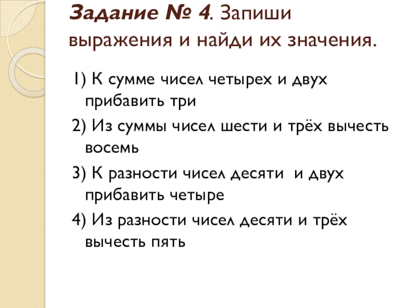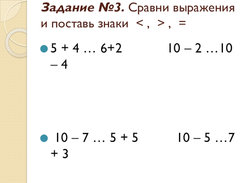 5 + 4 … 6+2 10 – 2 …10 – 4