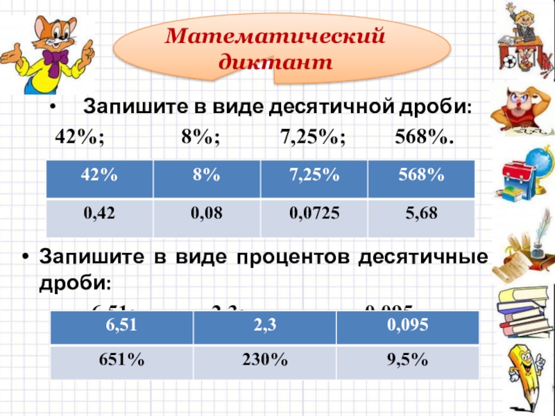 Чтобы записать проценты в виде десятичной дроби, нужно число процентов разделить на 100.