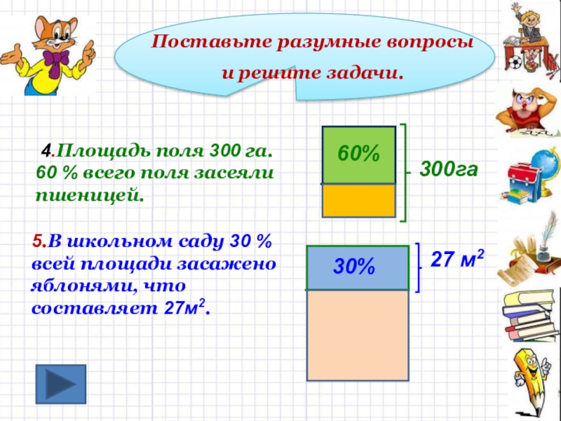 5.В школьном саду 30 % всей площади засажено яблонями, что составляет 27м2.