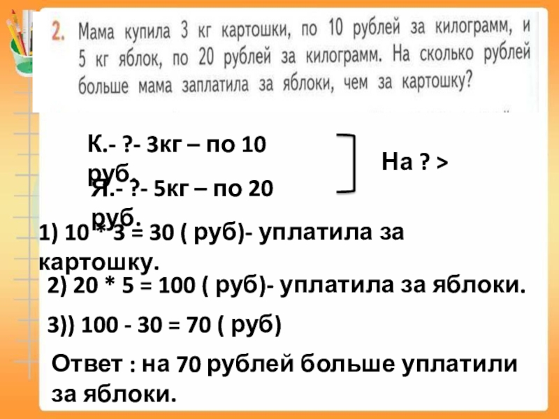 Ответ : на 70 рублей больше уплатили за яблоки.