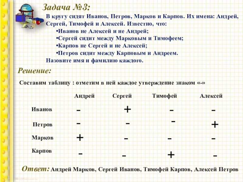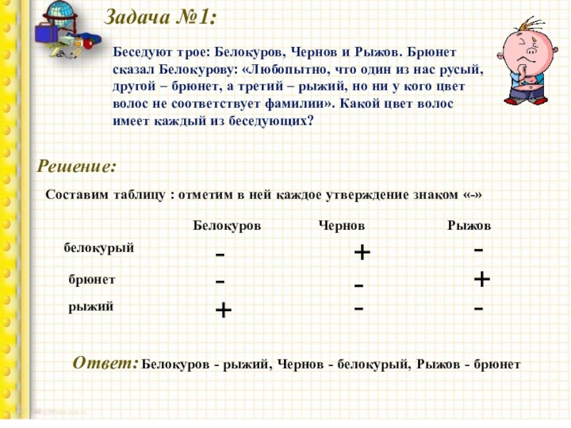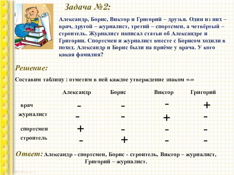 Составим таблицу : отметим в ней каждое утверждение знаком «-»