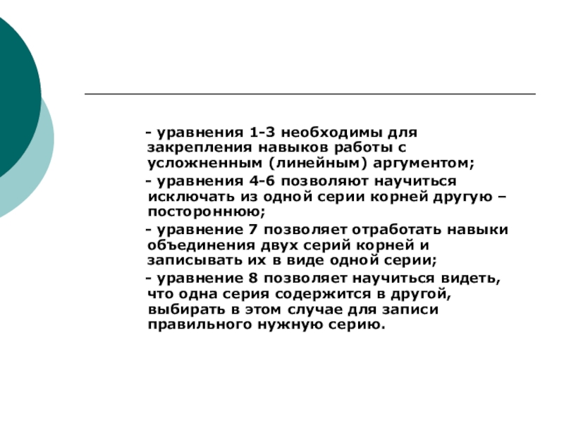 - уравнения 1-3 необходимы для закрепления навыков работы с усложненным (линейным) аргументом;  - уравнения