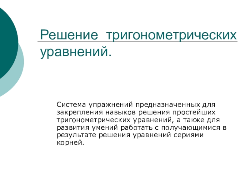 Решение тригонометрических уравнений.Система упражнений предназначенных для закрепления навыков решения простейших тригонометрических уравнений, а также для развития умений работать с получающимися в результате решения уравнений сериями корней.