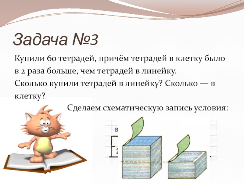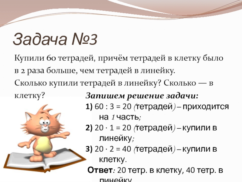 1) 60 : 3 = 20 (тетрадей) – приходится на 1 часть;