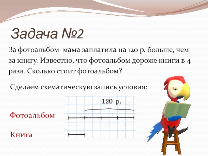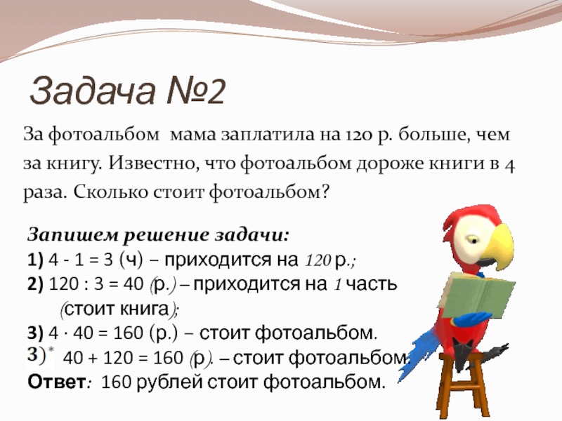 2) 120 : 3 = 40 (р.) – приходится на 1 часть (стоит книга);