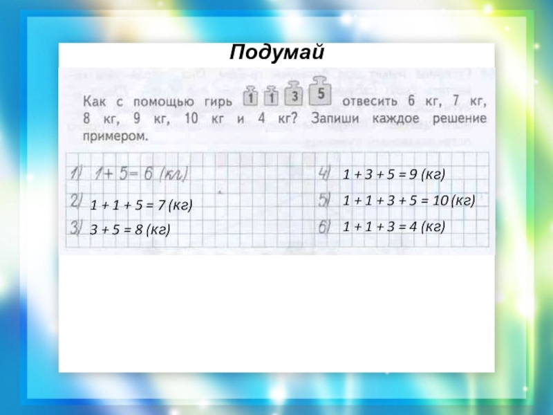 1 + 1 + 3 + 5 = 10 (кг)