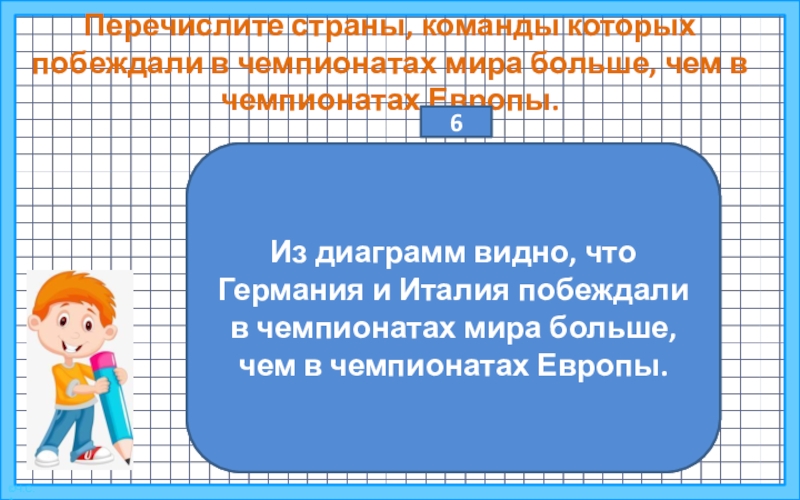 Из диаграмм видно, что Германия и Италия побеждали в чемпионатах мира больше, чем в чемпионатах Европы.