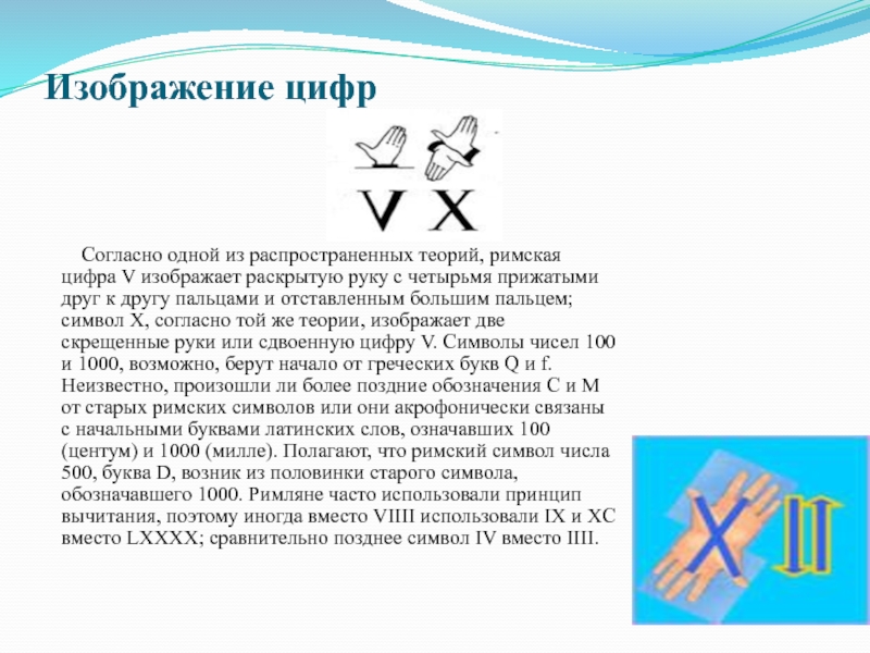 Согласно одной из распространенных теорий, римская цифра V изображает раскрытую руку с четырьмя прижатыми друг к другу пальцами и отставленным большим пальцем; символ X, согласно той же теории, изображает две скрещенные руки или сдвоенную цифру V. Символы чисел 100 и 1000, возможно, берут начало от греческих букв Q и f. Неизвестно, произошли ли более поздние обозначения C и M от старых римских символов или они акрофонически связаны с начальными буквами латинских слов, означавших 100 (центум) и 1000 (милле). Полагают, что римский символ числа 500, буква D, возник из половинки старого символа, обозначавшего 1000. Римляне часто использовали принцип вычитания, поэтому иногда вместо VIIII использовали IX и XC вместо LXXXX; сравнительно позднее символ IV вместо IIII.
