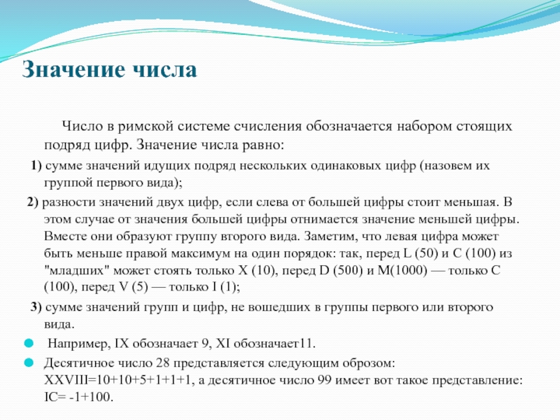 Десятичное число 28 представляется следующим оброзом: XXVIII=10+10+5+1+1+1, а десятичное число 99 имеет вот такое представление: IC= -1+100.