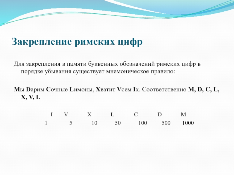 Для закрепления в памяти буквенных обозначений римских цифр в