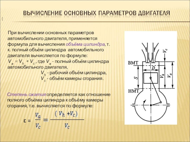 Степень сжатия определяется как отношение полного объёма цилиндра к объёму камеры сгорания, т.е. вычисляется по формуле: