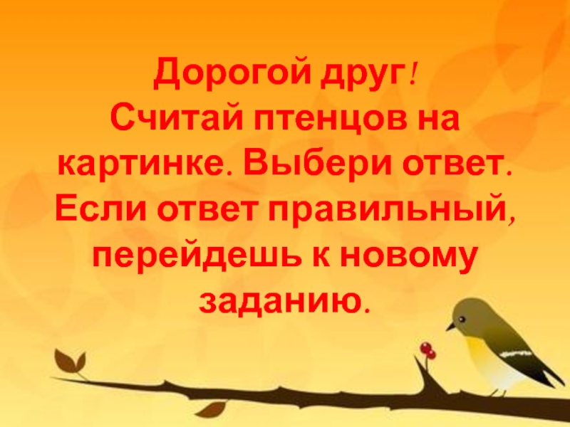 Слайд 2Дорогой друг! Считай птенцов на картинке. Выбери ответ. Если ответ правильный, перейдешь