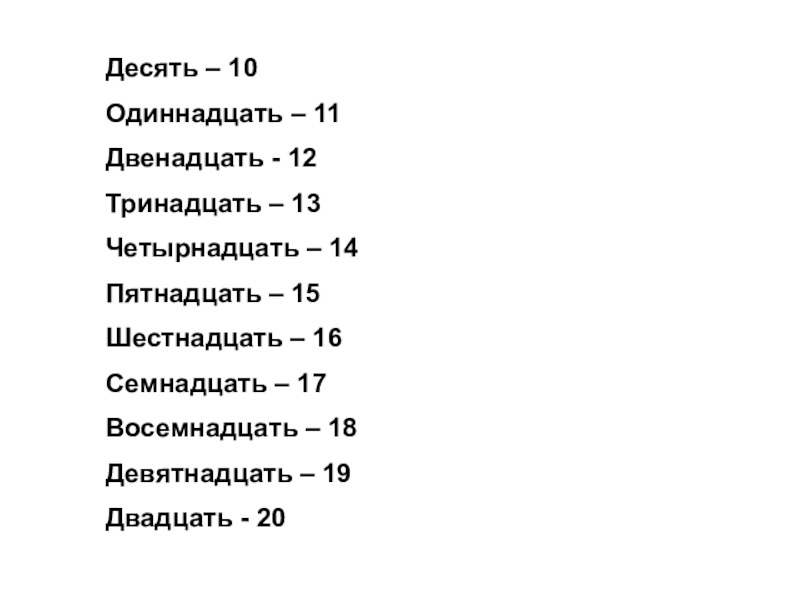 Десять – 10Одиннадцать – 11Двенадцать - 12Тринадцать – 13Четырнадцать – 14Пятнадцать – 15Шестнадцать – 16Семнадцать – 17Восемнадцать – 18Девятнадцать – 19Двадцать - 20