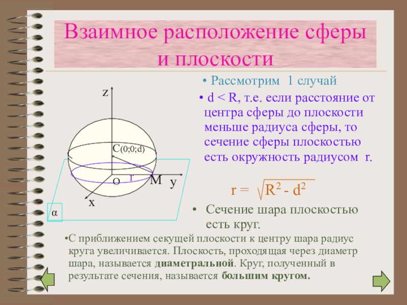 d < R, т.е. если расстояние от центра сферы до плоскости меньше радиуса сферы, то сечение сферы плоскостью есть окружность радиусом r.