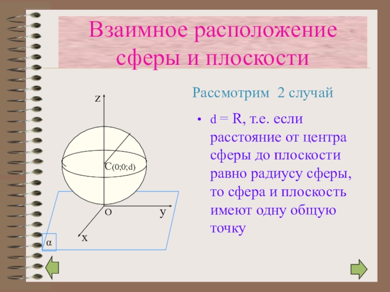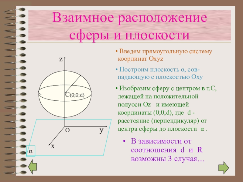 Изобразим сферу с центром в т.С, лежащей на положительной полуоси Oz и имеющей координаты (0;0;d), где d - расстояние (перпендикуляр) от центра сферы до плоскости α .