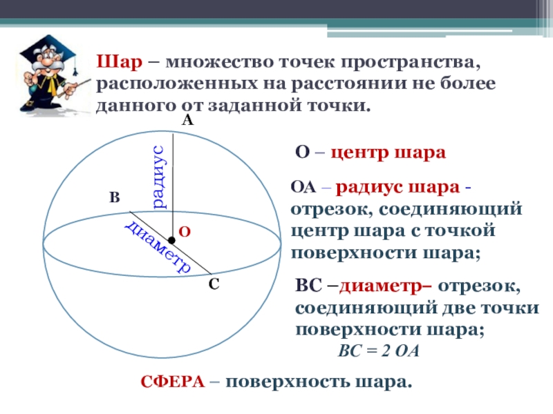 ВС –диаметр– отрезок, соединяющий две точки поверхности шара;