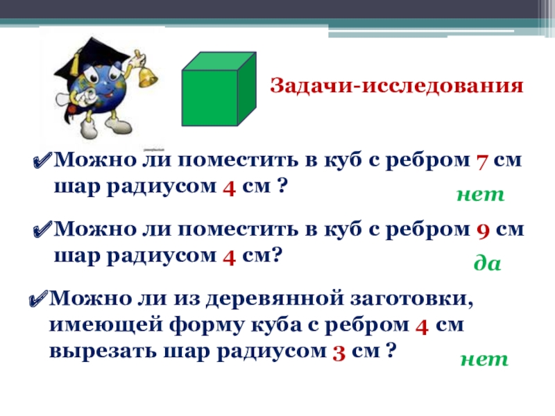 Можно ли поместить в куб с ребром 9 см шар радиусом 4 см?
