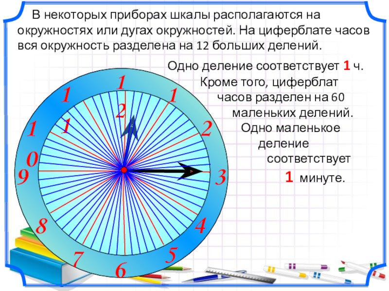 В некоторых приборах шкалы располагаются на окружностях или дугах окружностей. На циферблате часов вся окружность разделена на 12 больших делений.