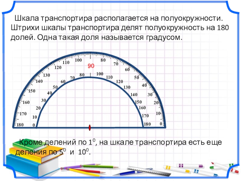 Кроме делений по 10, на шкале транспортира есть еще деления по 50 и 100.