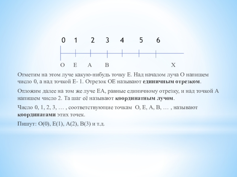 Число 0, 1, 2, 3, … , соответствующие точкам О, Е, А, В, … , называют координатами этих точек.
