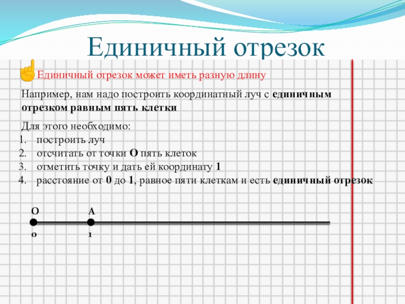 расстояние от 0 до 1, равное пяти клеткам и есть единичный отрезок
