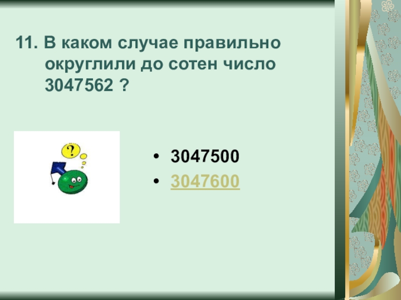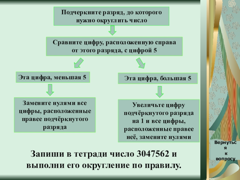 Запиши в тетради число 3047562 и выполни его округление по правилу.