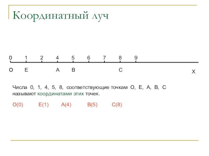 Над началом луча О напишем число 0, а над точкой Е число 1.