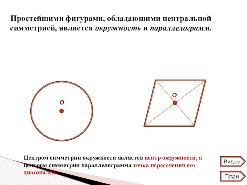 Центральная симметрия- отображение пространства на себя, при котором любая точка переходит в симметричную ей точку, относительно центра О.