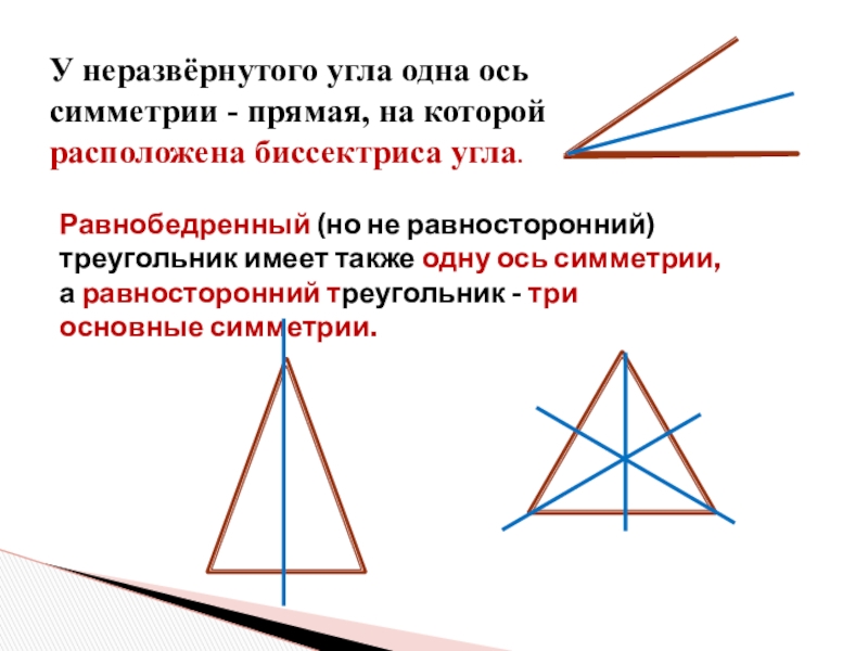 Равнобедренный (но не равносторонний) треугольник имеет также одну ось симметрии, а равносторонний треугольник - три основные симметрии.