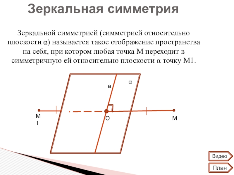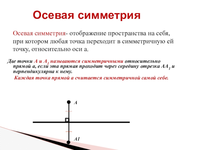 Осевая симметрия- отображение пространства на себя, при котором любая точка переходит в симметричную ей точку, относительно оси а.
