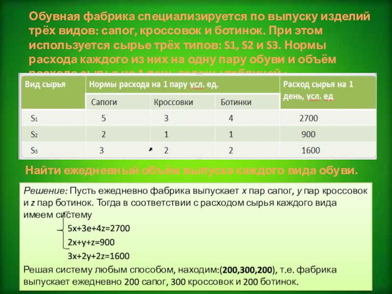 Решение: Пусть ежедневно фабрика выпускает х пар сапог, у пар кроссовок и z пар ботинок. Тогда в соответствии с расходом сырья каждого вида имеем систему