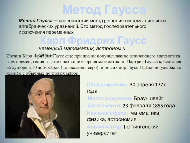 Иоганн Карл Фридрих Гаусс еще при жизни получил звание величайшего математика всех времен, гения и даже прозвище «короля математики». Портрет Гаусса красовался на купюре в 10 дойчмарок (до введения евро), и до сих пор Гаусс загадочно улыбается немцам с обычных почтовых марок