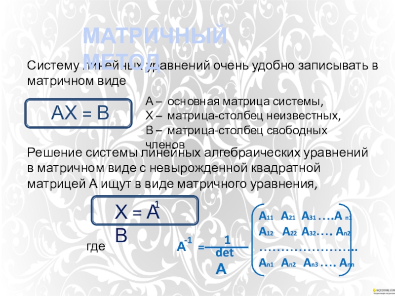 Решение системы линейных алгебраических уравнений в матричном виде с невырожденной квадратной матрицей А ищут в виде матричного уравнения,