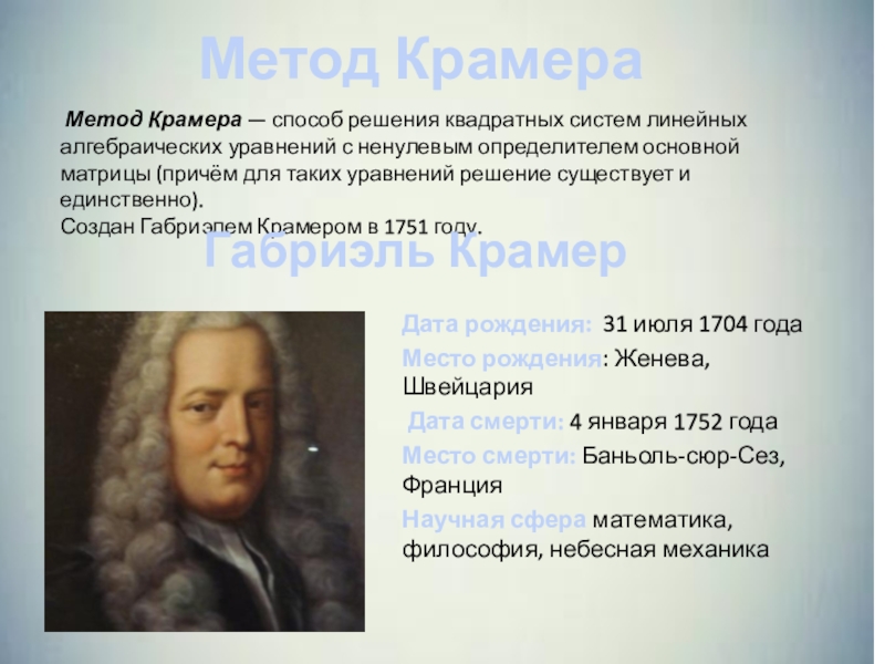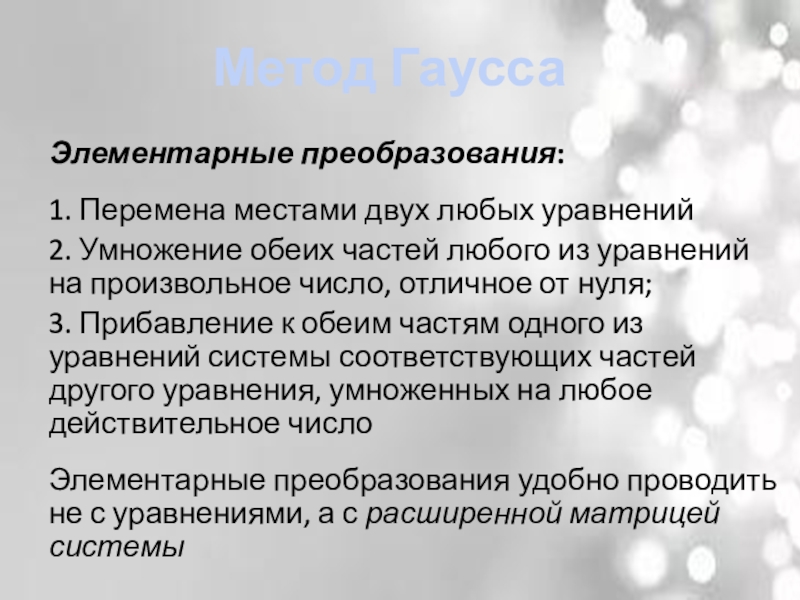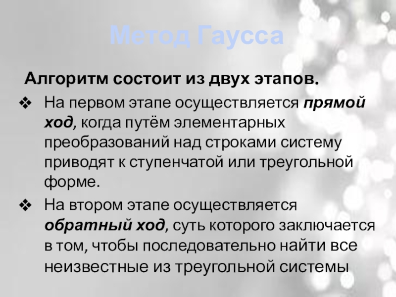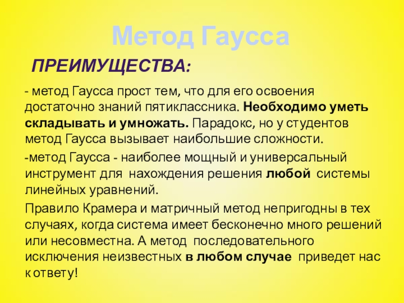 Метод Гаусса — классический метод решения системы линейных алгебраических уравнений. Это метод последовательного исключения переменных