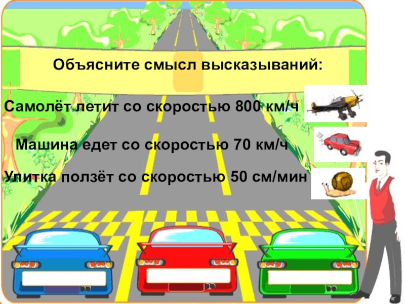 Самолёт летит со скоростью 800 км/чМашина едет со скоростью 70 км/чУлитка ползёт со скоростью 50 см/минОбъясните смысл