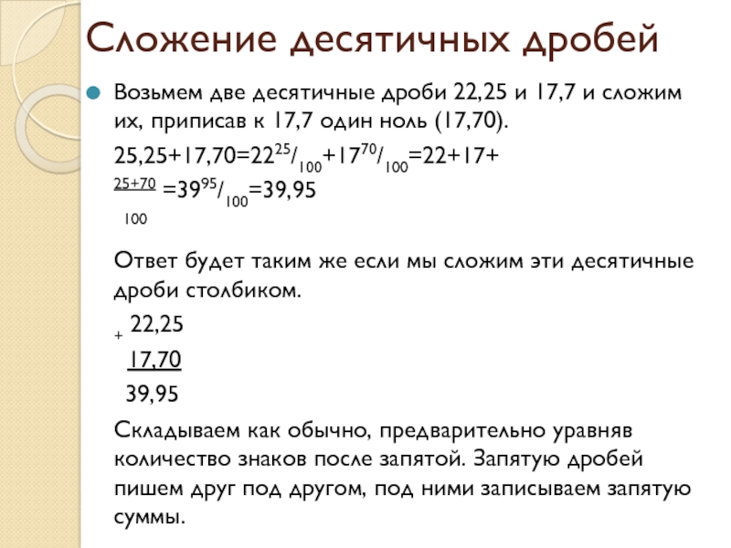Возьмем две десятичные дроби 22,25 и 17,7 и сложим
