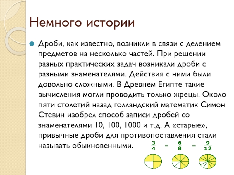 несколько частей. При решении разных практических задач возникали дроби с разными знаменателями. Действия с ними были довольно сложными. В Древнем Египте такие вычисления могли проводить только жрецы. Около пяти столетий назад голландский математик Симон Стевин изобрел способ записи дробей со знаменателями 10, 100, 1000 и т.д. А «старые», привычные дроби для противопоставления стали называть обыкновенными.