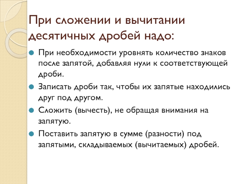 Слайд 6При сложении и вычитании десятичных дробей надо: