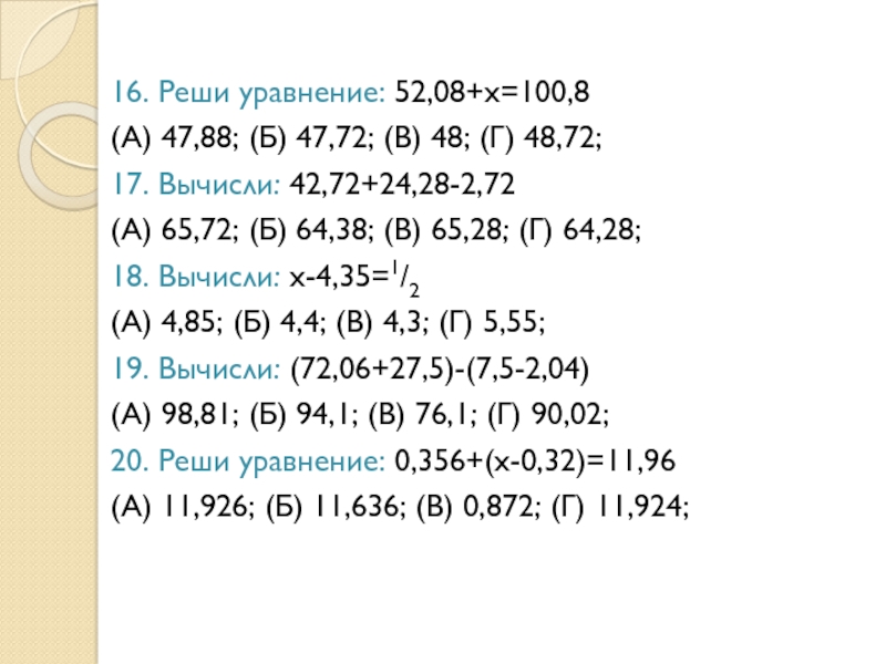 Слайд 1316. Реши уравнение: 52,08+х=100,8